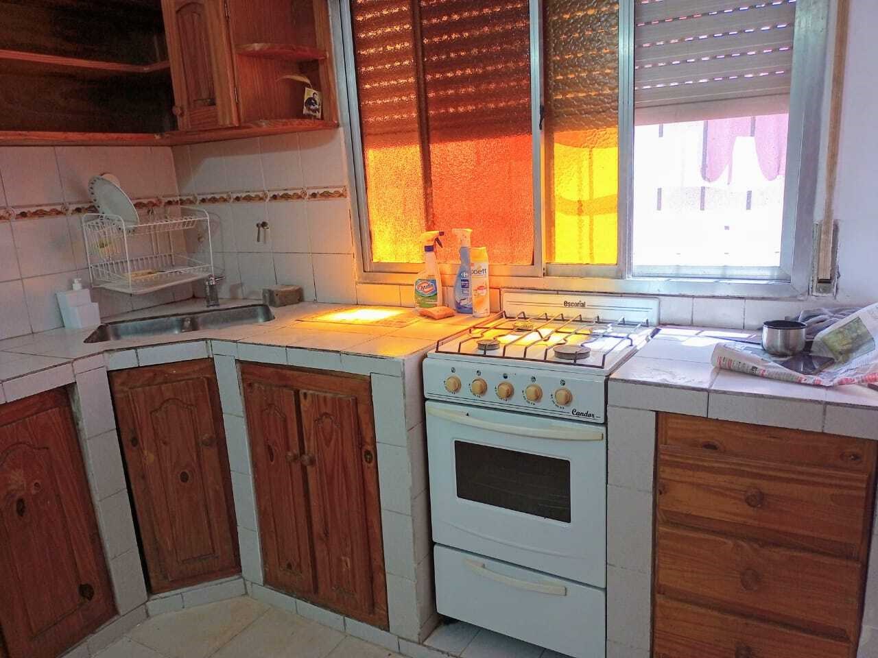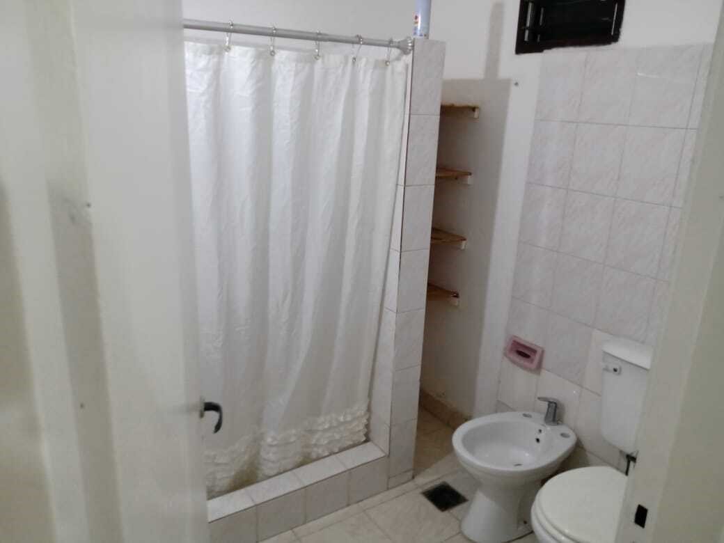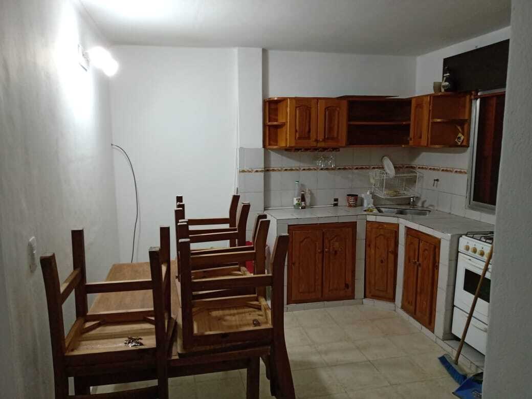 Cocina comedor con mesada de mampostería con espacio para lavarropas y salida a patio compartido.